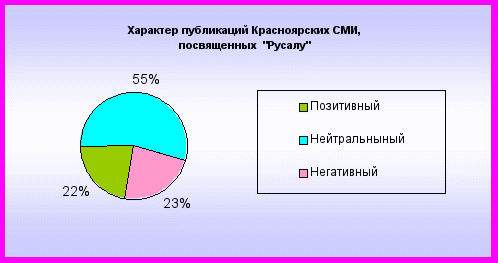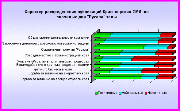 Как следует из представленной диаграммы, чуть более половины материалов носит нейтрально-новостной характер. В сочетании со статьями, оформленными в благожелательном ключе, публикации создают в целом достаточно благоприятный фон для позиционирования холдинга в крае. И хотя число публикаций негативной направленности несколько превосходит позитив, в целом, можно говорить о том, что медийная картина вокруг «Русала» сбалансирована и создает ощущение объективности представленной информации. Это говорит о грамотной имиджевой политике пресс-службы компании в регионе.