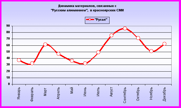 Согласно приведенным данным, число имиджеобразующих публикаций, посвященных непосредственно «Русалу», в красноярских СМИ на протяжении года остается достаточно высоким – не менее 30 материалов в месяц. Всплеск интереса масс-медиа в марте-апреле обусловлен актуализацией темы отмены толлинга, а также проводимой «Русалом» в местной прессе PR-кампанией.