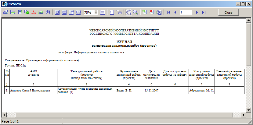 Журнал дипломных работ: доступен на форме «Журнал регистрации дипломных работ» при выборе группы в дереве групп (рис. 31). Для вызова этого отчета нужно выполнить команду «Отчеты/Журнал дипломных» или нажать кнопку