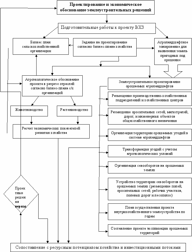 В основе комплексной организации территории орошаемых агроландшафтов лежит научно обоснованный комплексный проект внутрихозяйственного землеустройства, без которого невозможно рационально организовать производство и территорию. Он ориентирован на максимальное удовлетворение экономических интересов землевладельцев и землепользователей и направлен на организацию рационального и высокоэффективного использования земель. Его разработка и реализация должны базироваться на методах инвестиционного анализа и бизнес-планирования.