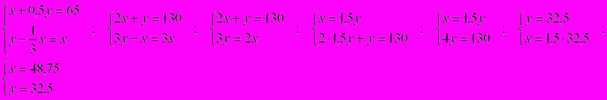 Даны два числа. Если к первому прибавить половину второго, то получится 65, а если из второго вычесть третью часть первого, то получится первое число. Най-дите эти числа.
