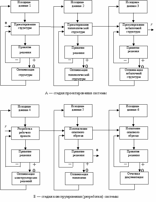 Ствол (контур) 1 — проектирование структуры системы. Исходные данные 1: функциональная структура, алгоритмы управления и функционирования, ресурсы, базы данных (БД), традиции и опыт — база знаний (БЗ), цели и ограничения. Проектные процедуры: 1) элементное отображение алгоритмов; 2) синтез структуры в базисе функциональных устройств; 3) синтез принципиальных схем типовых устройств; 4) синтез структуры в базисе принципиальных схем устройств; 5) расчет параметров и оценка ограничений. Принятие решения: «–» — изменить: а) элементную базу; б) структуру устройств; в) состав функций системы; ТЗ. Прекратить проектирование. Обратная связь — повторить процесс (цикл) проектирования; «+» — оптимизация структуры системы по заданным критериям и ограничениям. Обратная связь — уточнить исходные данные.