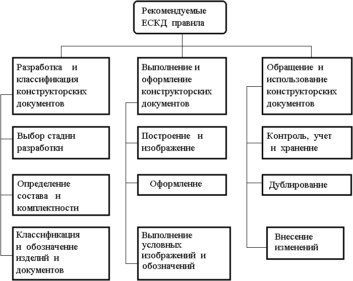 КПП производится отделом главного конструктора серийного завода (ОГК) или серийным отделом НИЧ, СКБ, ОКБ и т.д., в соответствии с правилами Единой системы конструкторской документации (ЕСКД). Состав и содержание ЕСКД представлены на рис. 6.9.