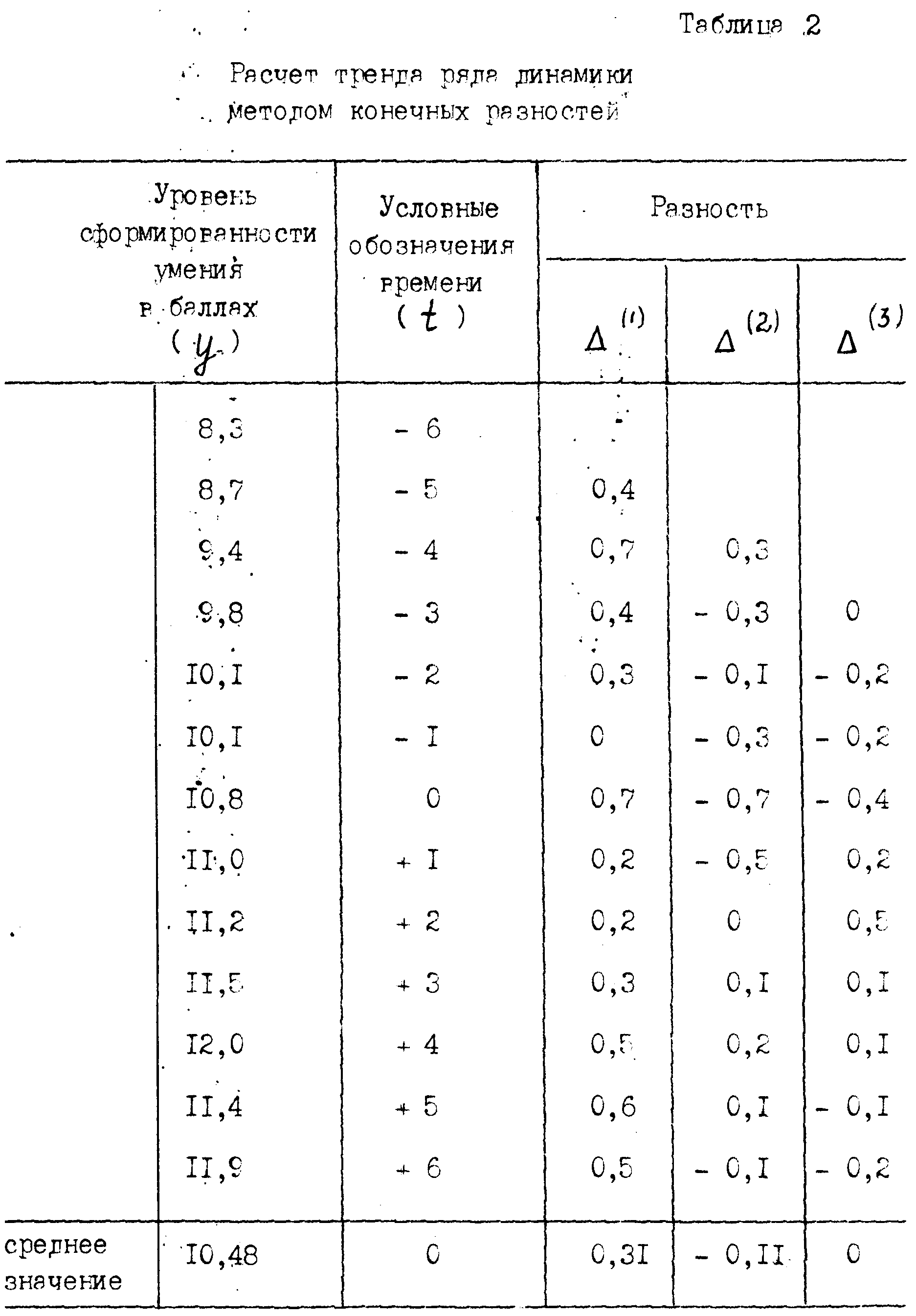 Средняя арифметическая третьих разностей равна 0, следовательно, основную тенденцию изменения уровня сформированности профессионально-методических умений на первой педагогической практике можно представить параболой второго порядка (расчеты в таблице 2), где