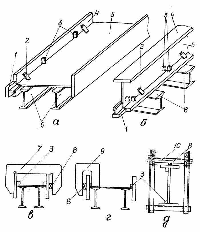 а — сборка в горизонтальном положении; б — сборка в вертикальном положении; в — стягивание листов сечения объемлющей скобой; г — стягивание листов сечения односторонней сборочной скобой; д — стягивание листов сечения хомутом; 1 — выводные планки; 2 — наклонные соединительные планки; 3 — временные упоры; 4 — горизонтальные листы (полки); 5 — вертикальный лист (стенка); 6 — прокатные балки стеллажа; 7 — объемлющая сборочная скоба; 8 — сборочный клин; 9 — односторонняя сборочная скоба; 10 — сборочный хомут.