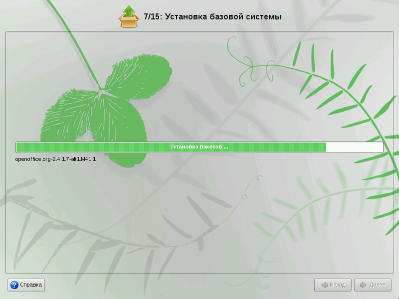 На этом этапе происходит установка стартового набора программ, необходимых для запуска и первоначальной настройки Linux. Далее в процессе установки у вас будет возможность выбрать и установить все необходимые вам для работы приложения.