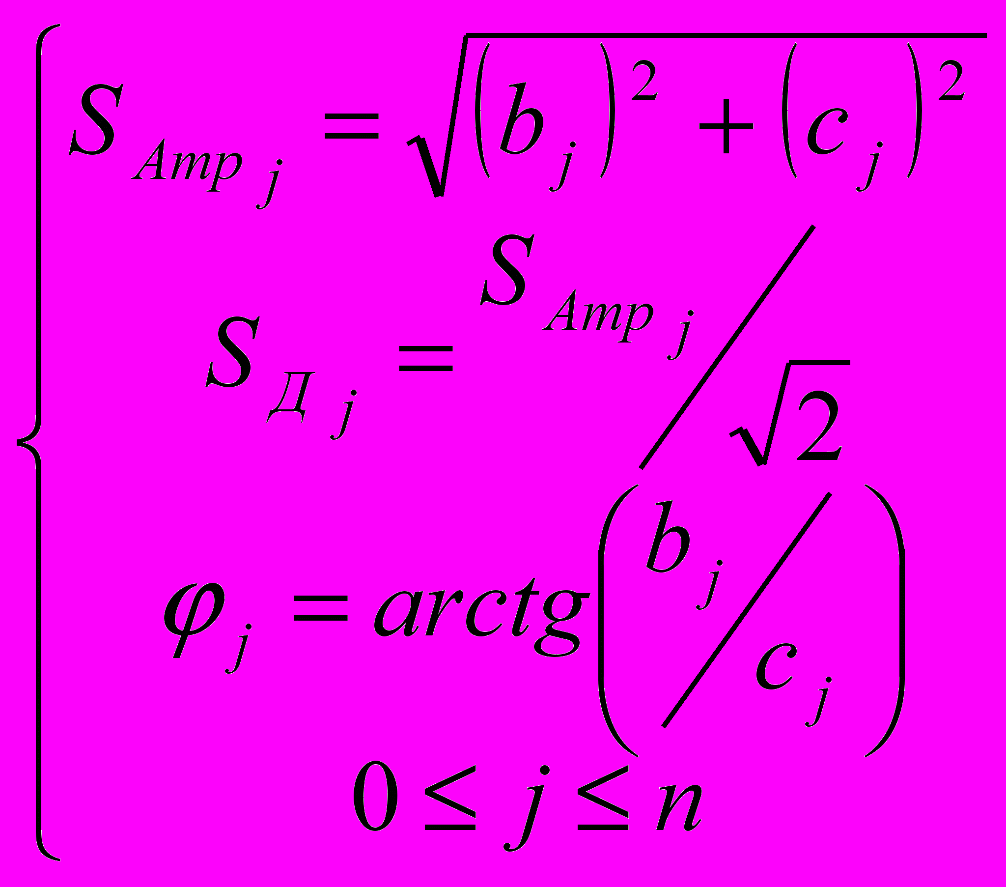 - векторы решения и свободных членов соответственно.Амплитуда (ед. АЦП), действующее значение (ед. АЦП) и фаза регистрации сигнала, измеряемого и регистрируемого по j-му каналу, определяются в соответствии с соотношением (10) в виде:
