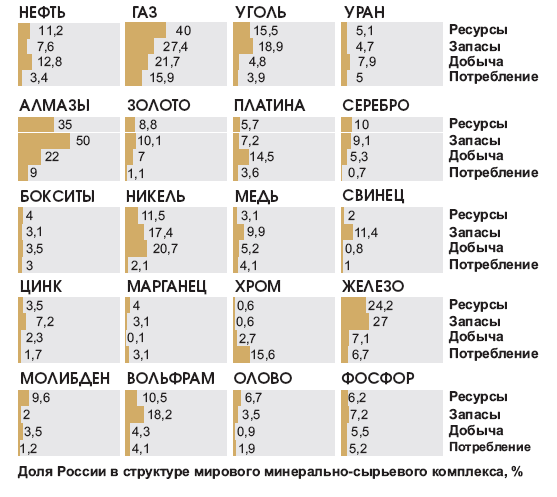 Ни у кого не вызывает сомнений, что Россия по своим минеральным богатствам входит в группу стран-лидеров. В недрах Российской Федерации разведана значительная часть мировых запасов важнейших видов полезных ископаемых: половина запасов алмазов, более четверти – природного газа и железа, около 20 % – палладия и углей, 17 % – никеля, а также от 7 % до 10 % – нефти, золота, серебра, платины и др.