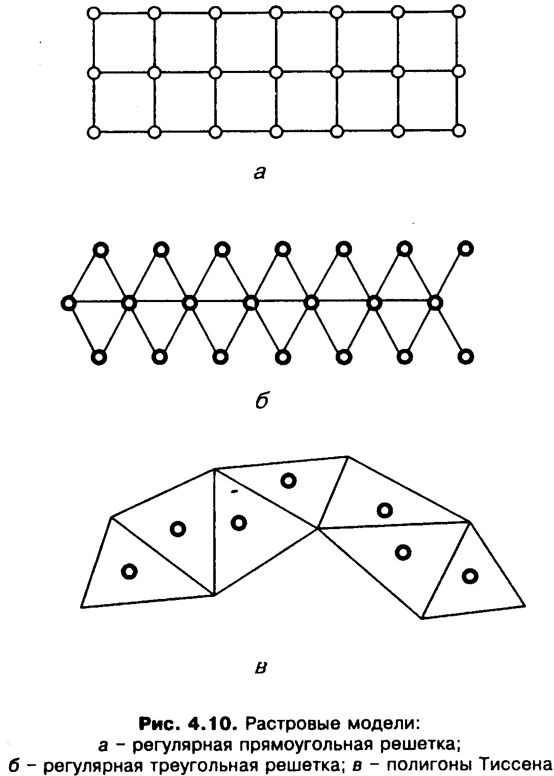 Среди нерегулярных мозаик чаще всего используют треугольные сети неправильной формы (Triangulated Irregular Network - TIN) и полигоны Тиссена (рис. 4.10, в). Сети TIN удобны для создания цифровых моделей отметок местности по заданному набору точек. Они применяются как в растровых, так и в векторных моделях.