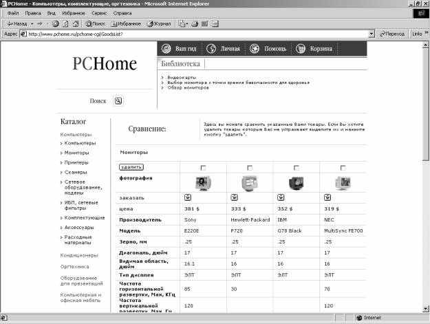 Например, интернет-магазин PCHome (www.pchome.ru) наряду с оказанием услуг по продаже товаров, предлагает потребителям возможность сравнения их характеристик. На рис. 6.1. представлена страница сайта, сформированная после выбора для сравнения ряда моделей компьютерных мониторов.