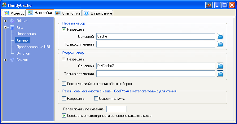 В этом окне можно настроить 2 набора кэшей. Активным может быть только один из наборов. Это пригодится, например, если у вас есть несколько кэшей на разных компьютерах в локальной сети или на флэшке. Переключаясь между наборами, вы можете быстро указать HC, с каким кэшем ему работать.