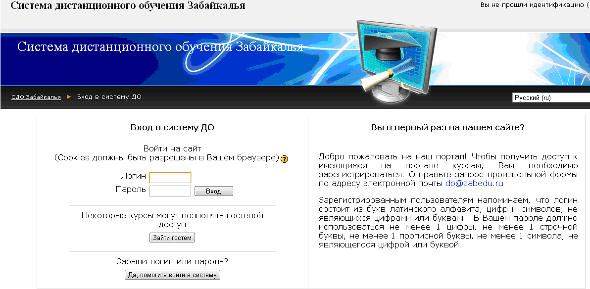 - Далее ввести логин и пароль, который можно получить у учителя, поддерживающего данный курс. Для разработчиков курсов и сетевых учителей необходимо обратиться за учетной записью в отдел дистанционного обучения ЦИТОиДО, отправив запрос на e-mail do.cit@zabedu.ru или do@zabedu.ru;