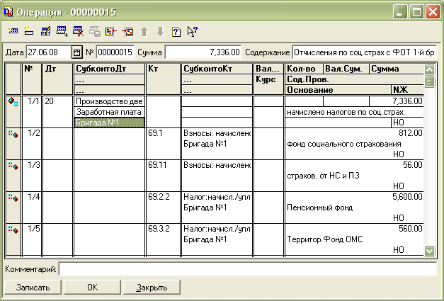 В бухучете часто встречаются такие хозяйственные операции, когда в дебет одного счета списывается сумма с кредита нескольких счетов или наоборот – с дебета нескольких счетов списывается сумма в кредит одного счета. Примером таких операций в задании может служить списание затрат в дебет 20-го счета или начисление налогов на фонд оплаты труда. Для описания таких хозяйственных операций в программе 1С:Бухгалтерия введено понятие сложная проводка. Сложная проводка содержит главную и подчиненные корреспонденции. При вводе такой операции в первой строке вводится главный счет дебет 20, счет кредит не вводится, а в колонке Сумма осуществляется ввод итоговой суммы всех страховых отчислений. Завершив ввод первой строки, нажимаем кнопку Insert и вводим первую подчиненную корреспонденцию, например отчисления в фонд социального страхования, не указывая уже счет дебет, а только счет кредит 69.1.. Так же вводим все остальные подчиненные корреспонденции, номера сложных проводок при этом записываются через дробную черту ( 1/1, 1/2, 1/3 и т.д. См. Рис.6.9 ). Ввод сложной проводки считается завершенным, когда сумма главной корреспонденции равна сумме подчиненных корреспонденций.