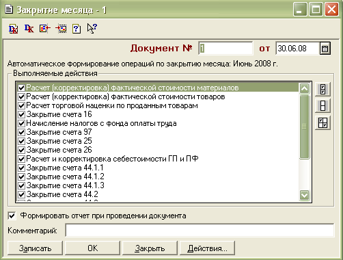 - В появившемся окне документа Закрытие месяца (Рис.6.11) установите формирование отчета при проведении документа. Записать. ОК.