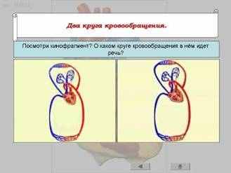 ![]() | В качестве закрепления учитель показывает два кинофрагмента. Учащиеся должны определить, о каком круге кровообращения в нем идёт речь. Этот слайд является завершающим для первого урока. Далее следует подведение итогов и домашнее задание.