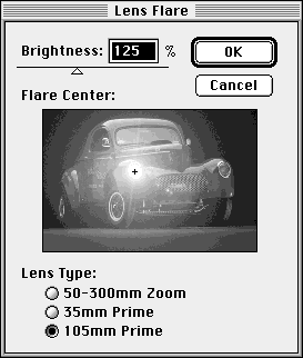 - Выберите команду меню Filter <> Render <> Lens Flare (Фильтр <> Освещение <> Блик). Появится окно диалога Lens Flare (Блик), показанное на рис. 6.3. В поле просмотра окна диалога перетащите перекрестье центра блика в центр левой фары автомобиля. Ползунок Brightness (Яркость) переместите к отметке 125. Установите переключатель Lens Type (Тип объектива) в положение 105 mm Prime (105 мм). Щелкните на кнопке OK, а затем повторите эти действия применительно к правой фаре автомобиля.