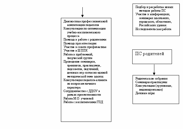 - Психологическое сопровождение педагогического процесса: повышение психологической культуры педагогов, семинары, семинары-практикумы, деловые игры и тренинги, педсоветы, диагностический аспект по актуальным темам. Родительские семинары.