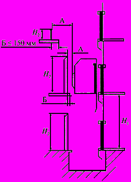 А - расстояние до движущихся элементов лифта; Б - расстояние между ограждением и краем межэтажных перекрытий, ступеней и площадок;