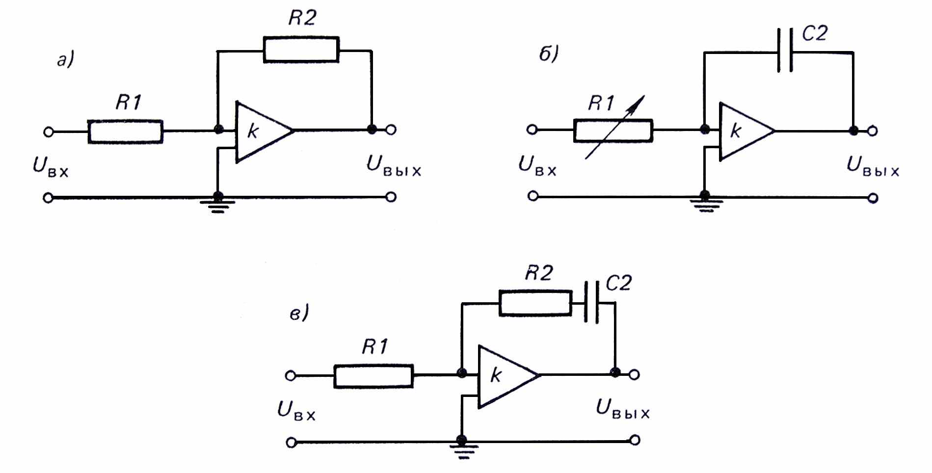 Рис.2 Схемы П, И и ПИ-регуляторов на операционных усилителях