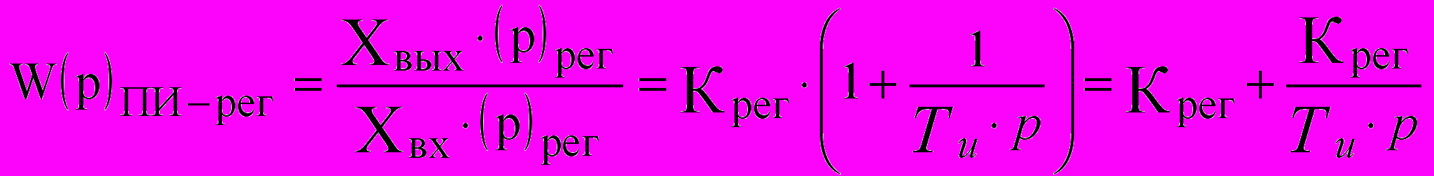 Коэффициенты — параметры настройки этого типа регулятора уже упомянутые: коэффициент усиления и время интегрирования. Передаточная функция ПИ-регулятора включает сумму пропорциональной и интегральной составляющей ПИ-регулятора. Сумма передаточных функций соответствует параллельно согласованному соединению элементов или звеньев. Такое же соединение заложено в структуру ПИ-регулятора. В случае отказа интегральной составляющей ПИ-регулятор будет работать как П-регулятор, что повышает надёжность работы регулятора.