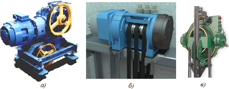 Рис. 1.Редукторные (а) и безредукторные (б, в) лифтовые лебедки