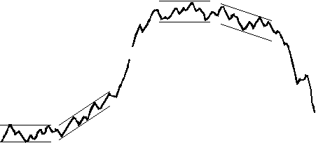 Рынок ещё не чувствует, что крупный спекулянт заложил под него бомбу замедленного действия. Цена идёт вверх не спеша, с откатами, предоставляя мелким и средним спекулянтам богатые возможности для игры. В это, поистине благодатное для участников рынка время, почти все игроки в выигрыше. Кто-то купил на откате и закрылся на пике: такой спекулянт имеет вполне реальную прибыль. Кто-то, напротив, не спешит продавать: он ждёт, пока цена вырастет ещё больше, довольствуясь бумажной прибылью. Когда же до основной массы торговцев доходит информация о трендообразующем событии, то все, кто ещё не купил, начинают понимать, что надо покупать. В результате цена совершает резкий рывок вверх. Индуцированная интервенция может ещё больше раскручиваться. Рынок входит в стадию реализации потенциала (см. рис. 7 и 8):