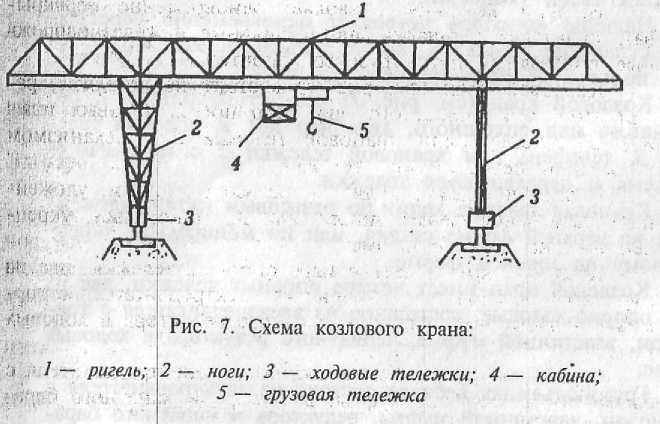 Козловой кран (см. рис.7) состоит из ригеля 1, решетчатого или сплошного, двух пар ног 2, ходовых тележек 3, тельфера или крановой тележки 5 с механизмом подъема и передвижения тележки.