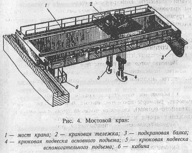 К мостовым кранам относятся краны, у которых несущие элементы конструкции опираются непосредственно на крановый путь (рис.4). Грузозахватный орган подвешен к грузовой тележке, тали или стреловому крану, перемещающимся по мосту.