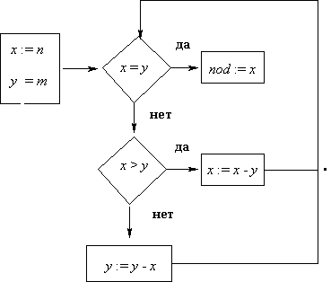 Приведенная здесь запись алгоритма нахождения НОД очень упрощенная. Запись, данная Евклидом, представляет собой страницу текста, причем последовательность действий существенно сложней.