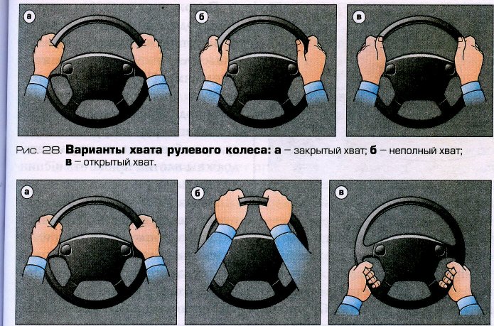 Поскольку водитель должен быть постоянно готов к действиям в критических ситуациях, рекомендуется закрытый хват (рис. 3а) – он естественнее. Неполный хват (рис. 3б) приемлем только при движении на больших скоростях, где требуется высочайшая точность руления. Благодаря тому, что большие пальцы упираются в обод рулевого колеса, «чувство руления» возрастает.