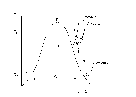 Обращаем внимание, что количество «пользы», т.е. работы за цикл увеличилось с увеличением Т1, но одновременно увеличились потери теплоты в конденсаторе, увеличились затраты теплоты за цикл. Здесь наглядно видно, что у дроби ηt увеличился и числитель и знаменатель, а результат неопределенен (см. (6.5)). Зато воочию видно, что увеличение Т1 до Т1΄ увеличивает