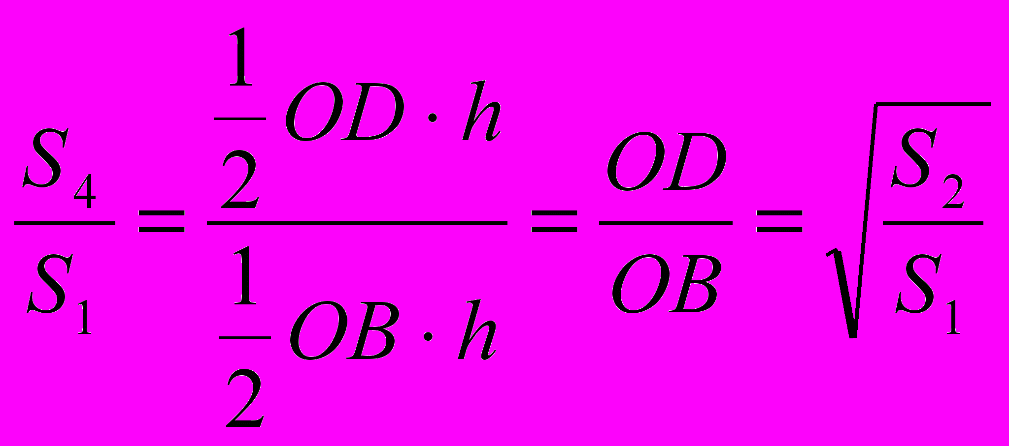 Решение. Сначала покажем, что S3 и S4 - площади треугольников АОВ и СОD равны. Действительно, треугольники АВD и АСD имеют общее основание АD и равные высоты – высоту трапеции. Следовательно, их площади равны, то есть S3+S2=S4+S2. Откуда следует, что S3=S4. Найдем площадь S4.Треугольники ВОС и АОD подобны. Площади подобных треугольников относятся как квадраты соответственных сторон, то есть
