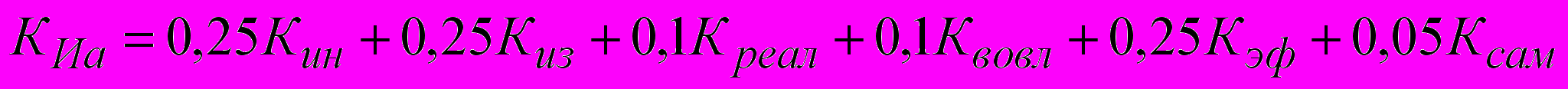 , (3)где КИа - коэффициент инновационной активности предприятия, Кин - коэффициент инновационности продукции, отражающий степень передела продукции и уровень добавленной стоимости; Киз - коэффициент затрат на инновации в общих расходах; Креал - коэффициент реализации инноваций; Квовл - коэффициент вовлеченности персонала в инновационный процесс; Кэф - коэффициент экономической эффективности (рентабельность инноваций); Ксам - коэффициент самостоятельности в инновациях. При этом доля каждого коэффициента устанавливается в зависимости от его вклада в создание стоимости предприятия.