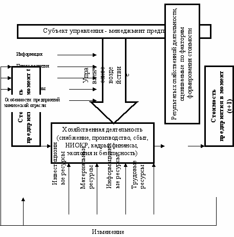 Согласно предложенному механизму управления, стоимость предприятия способна изменятся в результате управленческого воздействия на его хозяйственную деятельность. В то же время анализ и контроль ее динамики приводят к пересмотру планов развития и возможных альтернатив, к качественному и количественному изменениям располагаемых ресурсов. Если показатель стоимости предприятия увеличился по сравнению со значением предыдущего периода (т.е. если удалось создать добавленную ценность предприятию), то действующая система управления им признается эффективной.