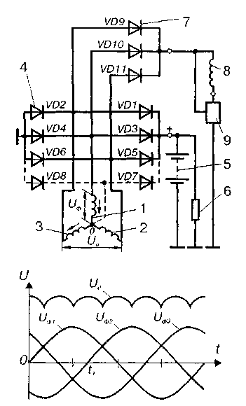 Рис.1. Принципиальная схема генераторной установки. Ur/IUr/e - напряжение н обмотках фаз; Urf -выпрямленное напряжение; 1,2,3- обмотки трех фаз статора; 4 -• диоды силового выпрямителя; 5 -аккумуляторная батарея; 6 - нагрузка; 7 - диоды выпрямителя обмотки возбуждения; 8 - обмотка возбуждения; 9 - регулятор напряжения