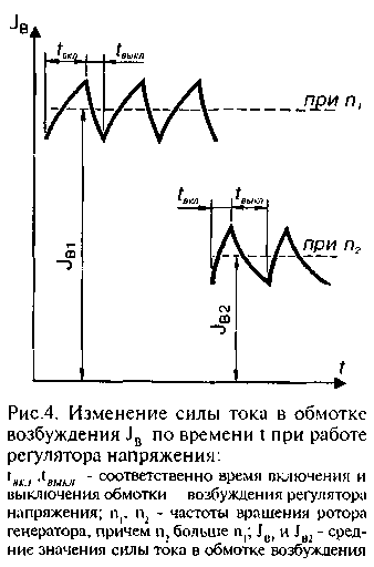пряжением этой величины, стабилитрон "пробивается" и по нему начинает протекать ток. Таким образом, стабилитрон в регуляторе является эталоном напряжения с которым сравнивается напряжение генератора. Кроме того известно, что транзисторы пропускают ток между коллектором и эмиттером, т. е. открыты, если в цепи "база - эмиттер" ток протекает, и не пропускают этого тока, т. е. закрыты, если базовый ток прерывается. Напряжение к стабилитрону VD2 подводится от вывода генератора "D+" через делитель напряжения на резисторах R1(R3 и диод VD1, осуществляющий температурную компенсацию. Пока напряжение генератора невелико и напряжение на стабилитроне ниже его напряжения стабилизации, стабилитрон закрыт, через него, а, следовательно, и в базовой цепи транзистора VT1 ток не протекает, транзистор VT1 также закрыт. В этом случае ток через резистор R6 от вывода "D+" поступает в базовую цепь транзистора VT2, который открывается, через его переход эмиттер - коллектор начинает протекать ток в базе транзистора VT3, который также открывается. При этом обмотка возбуждения генератора оказывается подключена к цепи питания через переход эмиттер - коллектор VT3.Соединение транзисторов VT2 и VT3, при котором их коллекторные выводы объединены, а питание базовой цепи одного транзистора производится от эмиттера другого, называется схемой Дарлингтона. При таком соединении оба транзистора могут рассматриваться как один составной транзистор с большим коэффициентом усиления. Обычно такой транзистор и выполняется на одном кристалле кремния. Если напряжение генератора возросло, например, из-за увеличения частоты вращения его ротора, то возрастает и напряжение на стабилитроне VD2, при достижении этим напряжением величины напряжения стабилизации, стабилитрон VD2 "пробивается", ток через него начинает поступать в базовую цепь транзистора VT1, который открывается и своим переходом эмиттер - коллектор закорачивает вывод базы составного транзистора VT2, VT3 на "массу". Составной транзистор закрывается, разрывая цепь питания обмотки возбуждения. Ток возбуждения спадает, уменьшается напряжение генератора, закрываются стабилитрон VT2, транзистор VT1, открывается составной транзистор VT2,VT3, обмотка возбуждения вновь включается в цепь питания, напряжение генератора возрастает и процесс повторяется. Таким образом регулирование напряжения генератора регулятором осуществляется дискретно через изменение относительного времени включения обмотки возбуждения в цепь питания. При этом ток в обмотке возбуждения изменяется так, как показано на рис.4. Если частота вращения генератора возросла или нагрузка его уменьшилась, время включения обмотки уменьшается, если частота вращения уменьшилась или нагрузка возросла - увеличивается. В схеме регулятора (см. рис.3) имеются элементы, характерные для схем всех применяющихся на автомобилях регуляторов напряжения. Диод VD3 при закрытии составного транзистора VT2,VT3 предотвращает опасные всплески напряжения, возникающие из-за обрыва цепи обмотки возбуждения со значительной индуктивностью. В этом случае ток обмотки возбуждения может замыкаться через этот диод и опасных всплесков напряжения не происходит. Поэтому диод VD3 носит название гасящего. Сопротивление R7 является сопротивлением же-
