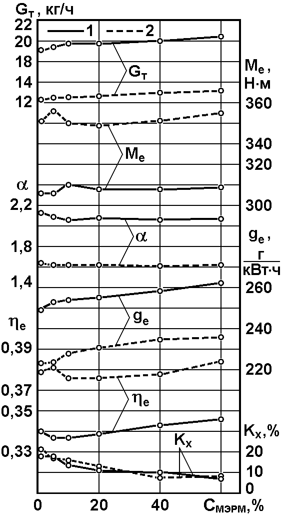 Улучшение качества процессов распыливания топлива и смесеобразования может быть достигнуто и без изменения конструкции распылителя за счет подбора оптимального состава смесевого биотоплива. Для оценки возможности улучшения показателей при использовании биотоплив проведены испытания дизеля Д-245.12С на смесях ДТ и МЭРМ. Исследованы смеси ДТ с МЭРМ с объемным содержанием последнего в смеси 0, 5, 10, 20, 40 и 60%. Испытания показали, что увеличение содержания МЭРМ в смесевом биотопливе СМЭРМ сопровождается ростом расхода топлива gе, вызванным меньшей теплотой сгорания МЭРМ (рис. 10,а). Однако при увеличении СМЭРМ в диапазоне от 0 до 20 % изменение эффективного КПД ηе не превышало 1%. Дальнейший рост СМЭРМ (до 40 и 60 %) сопровождался увеличением ηе. Увеличение СМЭРМ приводило к заметному снижению дымности ОГ Kx. При росте СМЭРМ с 0 до 60% дымность Кх снижалась: на режиме максимальной мощности при n=2400 мин-1 – в 2,6 раза (с 18 до 7% по шкале Хартриджа), на режиме максимального крутящего момента при n=1500 мин-1 – в 2,5 раза (с 21 до 8,5%).