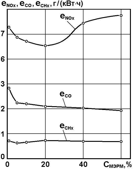 Использование биотоплив оказывает заметное влияние на выбросы с ОГ оксидов азота NOх и монооксида углерода СО (рис. 10,б). При увеличении СМЭРМ с 0 до 20% интегральный выброс оксидов азота еNOx снизился с 7,286 до 6,542 г/(кВт·ч), т.е. на 10,2 %, а при дальнейшем увеличении СМЭРМ до 40 и 60% отмечен некоторый рост еNOx (до значений соответственно до 7,441 и 7,759 г/(кВт·ч)). При росте СМЭРМ с 0 до 60 % отмечено монотонное снижение выброса монооксида углерода еСO с 2,834 до 1,932 г/(кВт·ч), т.е. почти в 1,5 раза. Зависимость выброса углеводородов СНx от содержания МЭРМ в смесевом топливе имеет более сложный характер, но, в целом, влияние СМЭРМ на выброс углеводородов незначителен.