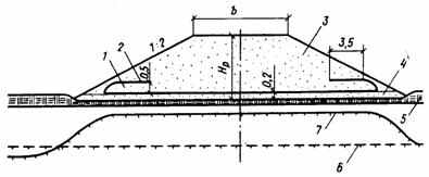 Рис. 88. Конструкция насыпи высотой более 1,5 м на вечномерзлых грунтах IV и V категории термопросадочности из дренирующих грунтов