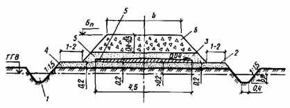 1 - канава; 2 - полка; 3, 4 - верхний и нижний песчаные слои; 5 - суглинистый слой; б - балластный слой; ГГВ - горизонт грунтовых вод