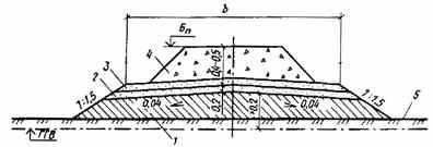 Рис. 9. Конструкция насыпи высотой до 3 м на болоте I типа, глубиной до 2 м, из дренирующих грунтов