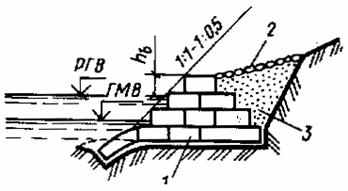 Укрепление берега производится железобетонными блоками на высоту набега волны с откосом 1:1 или 1:0,5, с засыпкой пазух песком и мощением из камня (рис. 65).