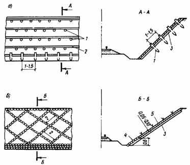 а - в клетках, образованных жердями; б - в клетках из каменных плит; 1 - деревянные колья; 2 - продольные жерди; 3 - растительный грунт с удобрениями; 4 - мощение откоса камнем; 5 - обсев дикорастущими семенами трав по слою толщиной 0,05 - 0,1 м