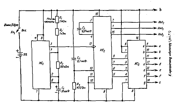 Схема на рис. 7.3 вырабатывает счетные коды, необходимые для работы индикатора, и после сборки ее можно подключить к индикатору, как показано на рис. 7.3. Источник, питания следует подсоединить лишь после окончания сборки всего устройства.