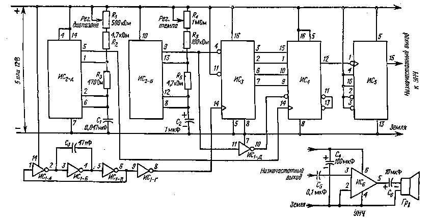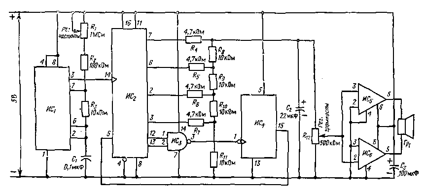 ИC1 — таймер типа 555; ИС2 — 4-разрядный двоичный счетчик типа 74191; ИСз — четыре двухвходовых логических вентиля И-НЕ типа 7400; ИС4 — двойной J — К-триггер типа 7476; ИC5. ИСВ — УНЧ типа LM386; R1 — потенциометр 1 МОм; R2 — резистор 100 кОм, 0,25 Вт; R3, R8 — R11 — резистор 10 кОм, 0,25 Вт; R4 — R7 — резистор 4,7 кОм, 0,25 Вт; r12 — потенциометр 500 кОм; Гр1 — громкоговоритель на постоянном магните с сопротивлением 3 Ом, C1 — конденсатор 0,1 мкФ; С2-электролитическай конденсатор 22 мкФ, 35 В; С3 - электролитический конденсатор 100 мкФ, 35 В.