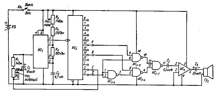 На рис. 9.4 показана принципиальная схема устройства типа синтезатора, представляющего собой комбинированный звуковой генератор, который в зависимости от положения регуляторов вырабатывает два различных звуковых сигнала.