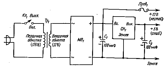 МВ1 — двухполупериодный выпрямитель мостового типа на напряжение 50 В и ток 6 A; CHi — стабилизатор напряжения типа 7805; Тр, — силовой трансформатор С выходным напряжением 12,6 В при токе 1,2 A; Ct, С2 — электролитический конденсатор 100 мкФ, 35 В.