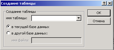 У цьому вікні в полі Ім’я таблиці (Имя таблицы) слід задати ім’я таблиці, що створюється і натиснути кнопку OK. Запит створення таблиці готовий. Щоб він почав виконуватися, слід натиснути кнопку виконання на панелі інструментів, а потім – кнопку OK у діалоговому вікні що відкрилося.