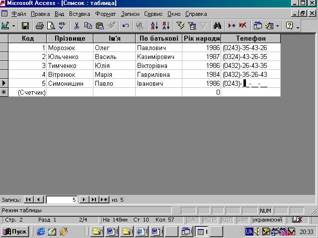 на панелі інструментів, або виконавши команду Вид – Режим таблицы. Введення даних ви будете робити в цьому режимі, заповнюючи клітини таблиці. Значення поля Код буде мінятися автоматично. Якщо закінчити введення даних в комірку натисканням клавіші [Enter], то маркер перейде в наступну клітину.
