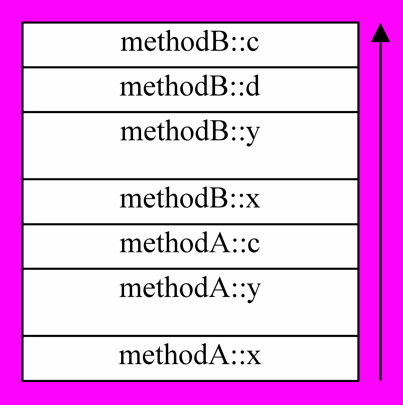 | void methodA (int x, float y) { int c; methodB (x, y, c); … -- Точка X } void methodB (int x, float y, int d) { int c; … -- Точка Y } |